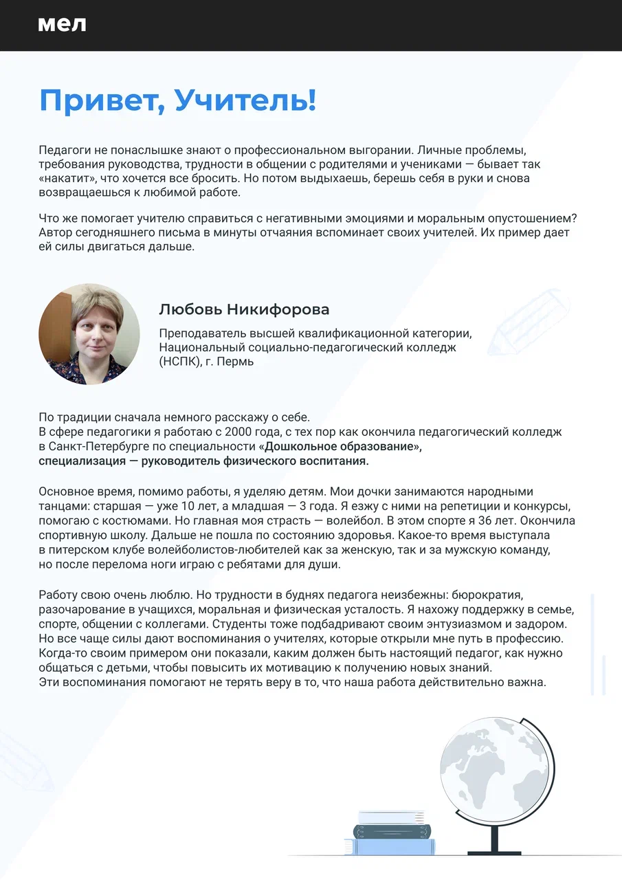 Если вы еще не подписались на рассылку «Привет, учитель!», советуем сделать это. Проект «Мела» — настоящая находка не только для работающих, но и для будущих педагогов. Благодаря ей вы сможете познакомиться с учителями со всей России и перенять их бесценный опыт.